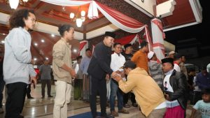 Sampang – Bupati Sampang H. Slamet Junaidi menyambut para perantau dan mahasiy yang dibiayai mudik secara gratis di Pendapa Trunojoyo, Senin (17/4/2023) dinihari.