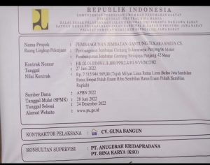 Namun sampai saat ini pihak (PPK ) Pejabat Pembuat Komitmen, (Nanto) Tidak ada pertanggung jawaban diduga kuat ada kerjasama dengan pihak Kontraktor CV Guna Bangun, hingga sampai saat ini proyek jembatan gantung tidak terselesaikan.