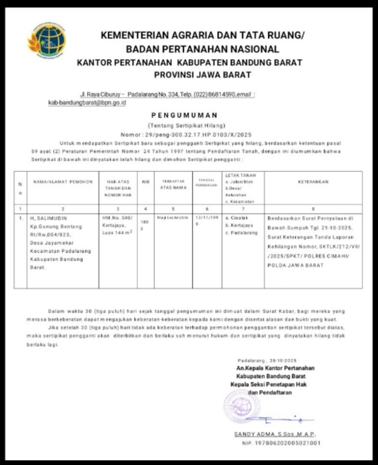 BPN Bandung Barat Umumkan Sertipikat Hilang
