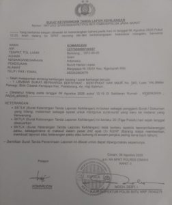 Dalam laporan tersebut disebutkan, sertipikat diketahui hilang pada Rabu, 6 Agustus 2025 sekitar pukul 12.19 WIB di sekitar rumah di wilayah Kertajaya, Padalarang.