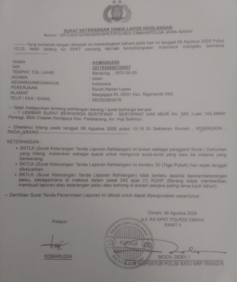 Berdasarkan Surat Keterangan Tanda Lapor Kehilangan (SKTLK) Nomor: SKTLK/212/VIII/2025/SPKT/Polres Cimahi/Polda Jawa Barat tertanggal 6 Agustus 2025, pelapor atas nama Komarudin (NIK: 3277030505720037) , warga Margajaya RT 05/01, Kecamatan Ngamprah, Kabupaten Bandung Barat, melaporkan kehilangan satu lembar surat berharga berupa :